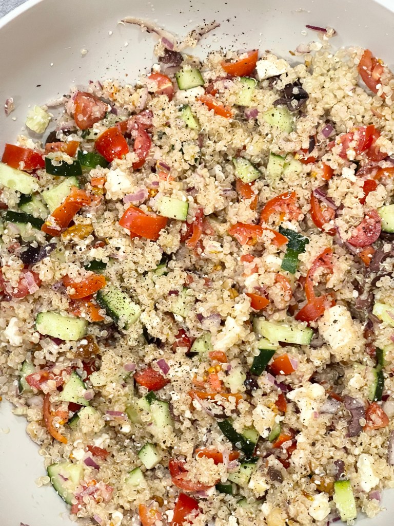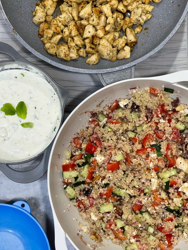 • Add cooked quinoa to large bowl and add all salad ingredients. Stir and season of required. Serve by placing salad on bottom, then chicken and drizzle with tzatziki .